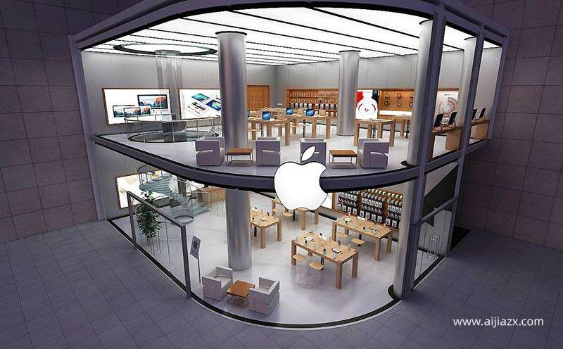 2,蘋果手機店裝修功能。方正的外觀是現(xiàn)代建筑設(shè)計的一個特征。全景落地玻璃貫穿兩層,使立面簡潔大氣。